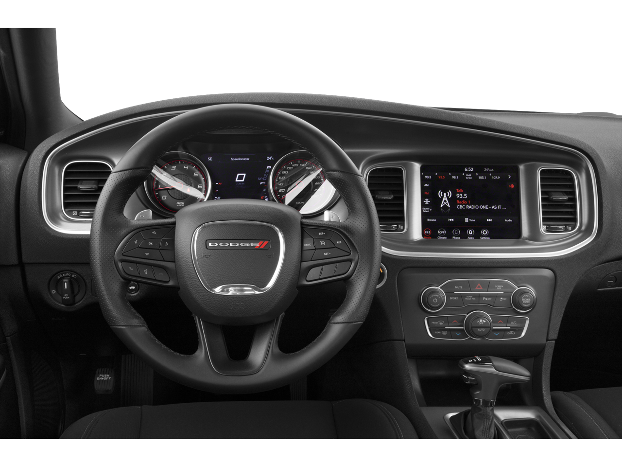 This vehicle comes equipped with : Blacktop Package (Black 1-Piece Performance Spoiler, Black Dodge Grille Badge, Blacktop R/T Badge, Gloss Black I/P Cluster Trim Rings, HEMI Blacktop Fender Badge, Rhombi 2-Pc Wheel Center Cap, Satin Black Charger Decklid Badge, Satin Black Dodge Tail Lamp Badge, and Wheels: 20" x 8" Black Noise Painted), Quick Order Package 26N, Black Cloth, 4-Wheel Disc Brakes, 6 Speakers, ABS brakes, Air Conditioning, Alloy wheels, AM/FM radio: SiriusXM, Anti-whiplash front head restraints, Apple CarPlay, Apple CarPlay/Android Auto, Auto-dimming Rear-View mirror, Automatic temperature control, Body Color Exterior Mirrors, Brake assist, Bumpers: body-color, Cloth Performance Seats, Compass, Delay-off headlights, Driver door bin, Driver vanity mirror, Dual front impact airbags, Dual front side impact airbags, Electronic Stability Control, Emergency communication system: SiriusXM Guardian, Four wheel independent suspension, Front anti-roll bar, Front Bucket Seats, Front Center Armrest, Front dual zone A/C, Front fog lights, Front reading lights, Fully automatic headlights, Garage door transmitter: HomeLink, Google Android Auto, GPS Antenna Input, Heated door mirrors, Illuminated entry, Integrated Center Stack Radio, Integrated Voice Command w/Bluetooth®, Knee airbag, Leather Shift Knob, Low tire pressure warning, Media Hub (2 USB, AUX), Occupant sensing airbag, Outside temperature display, Overhead airbag, Overhead console, Panic alarm, ParkView Rear Back-Up Camera, Passenger door bin, Passenger vanity mirror, Power 2-Way Driver Lumbar Adjust, Power door mirrors, Power driver seat, Power steering, Power Sunroof, Power windows, Radio: Uconnect 4C w/8.4" Display, Rear anti-roll bar, Rear reading lights, Rear seat center armrest, Rear window defroster, Remote keyless entry, Speed control, Speed-Sensitive Wipers, Split folding rear seat, Spoiler, Sport steering wheel, Steering wheel mounted audio controls, Tachometer, Telescoping steering wheel, Tilt steering wheel, Traction control, Trip computer, USB Host Flip, Variably intermittent wipers, and Wheels: 20" x 8" Satin Carbon Aluminum.