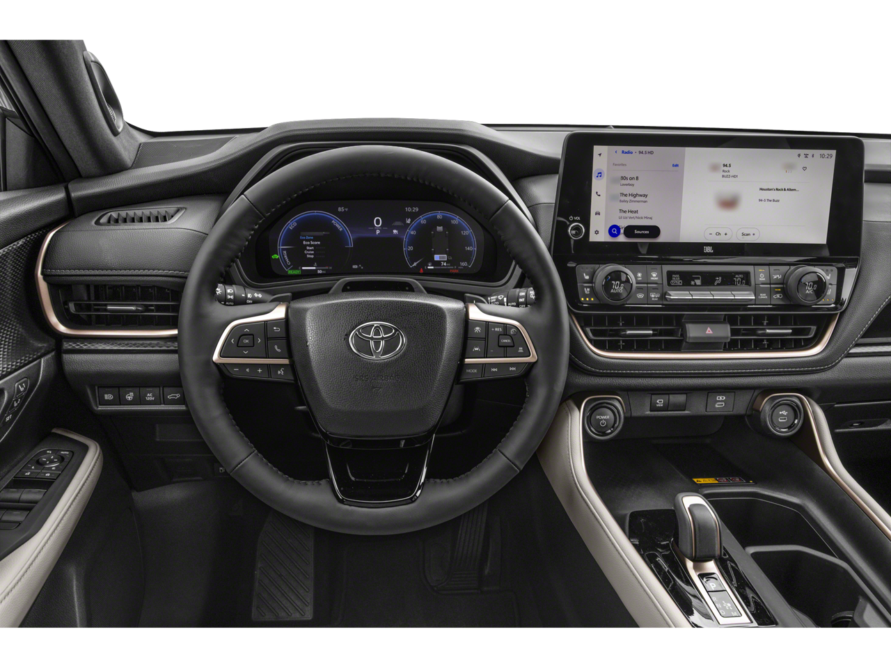 This vehicle comes equipped with: 2.4L 4-Cylinder, 11 Speakers, 3rd row seats: split-bench, 4-Wheel Disc Brakes, ABS brakes, Air Conditioning, Alloy wheels, AM/FM radio: SiriusXM, Apple CarPlay/Android Auto, Auto High-beam Headlights, Auto-dimming Rear-View mirror, Automatic temperature control, Brake assist, Bumpers: body-color, Delay-off headlights, Driver door bin, Driver vanity mirror, Dual front impact airbags, Dual front side impact airbags, Electronic Stability Control, Emergency communication system: Safety Connect (up to 10-year trial subscription), Exterior Parking Camera Rear, Four wheel independent suspension, Front anti-roll bar, Front Bucket Seats, Front Center Armrest, Front dual zone A/C, Front fog lights, Front reading lights, Fully automatic headlights, Garage door transmitter: HomeLink, Heads-Up Display, Heated and Ventilated Front Seats, Heated door mirrors, Heated front seats, Heated rear seats, Heated steering wheel, Illuminated entry, Knee airbag, Leather Shift Knob, Leather steering wheel, Low tire pressure warning, Memory seat, Navigation system: Drive Connect Cloud Navigation (1-year trial subscription), Occupant sensing airbag, Outside temperature display, Overhead airbag, Overhead console, Panic alarm, Passenger door bin, Passenger vanity mirror, Power door mirrors, Power driver seat, Power Liftgate, Power moonroof, Power passenger seat, Power steering, Power windows, Radio: 12.3 Toyota Audio Multimedia with JBL Audio, Rain sensing wipers, Rear air conditioning, Rear anti-roll bar, Rear reading lights, Rear window defroster, Rear window wiper, Reclining 3rd row seat, Remote keyless entry, Security system, Speed control, Speed-sensing steering, Split folding rear seat, Spoiler, Steering wheel mounted audio controls, Telescoping steering wheel, Tilt steering wheel, Traction control, Trip computer, Turn signal indicator mirrors, Ultrasuede/Leather Seat Trim, Variably intermittent wipers, Ventilated front seats, Ventilated rear seats, and Wheels: 20 2-Tone Multi-Spoke Aluminum.
